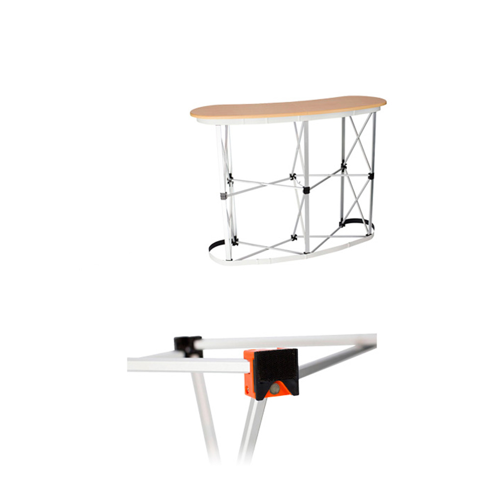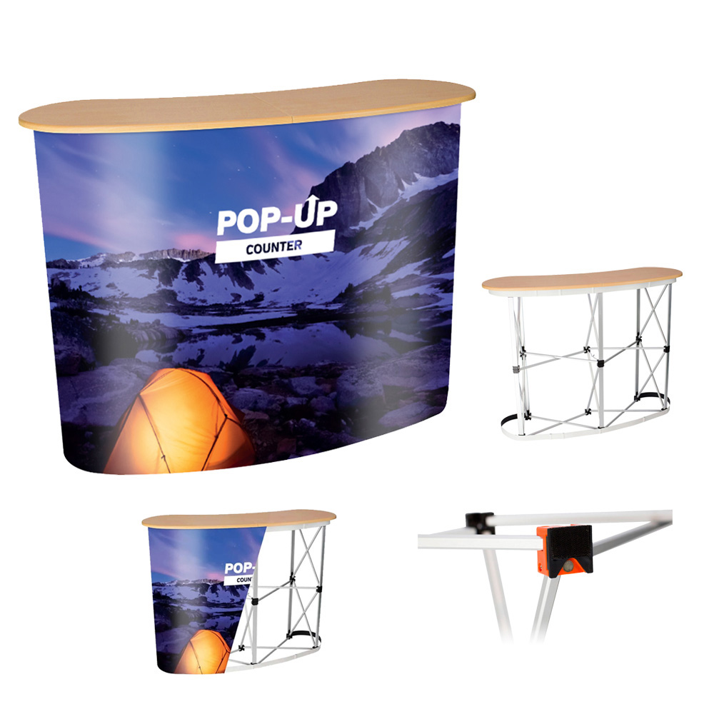 An elegant, high-quality counter with integrated shelves and graphic panel. This counter is handy pop-up counter that can be used for a wide range of purposes, either as presentation point, display table or reception desk.