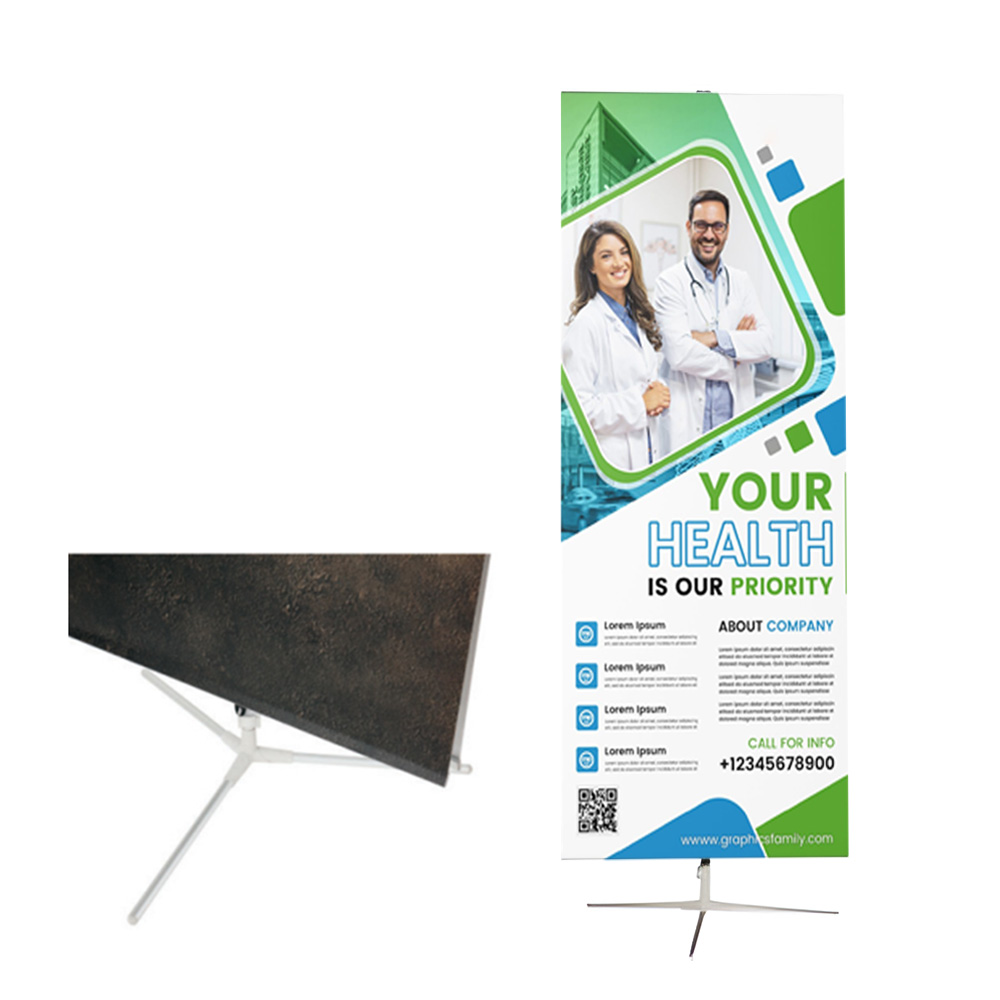 Double sided banner with special rotating foldable feet.